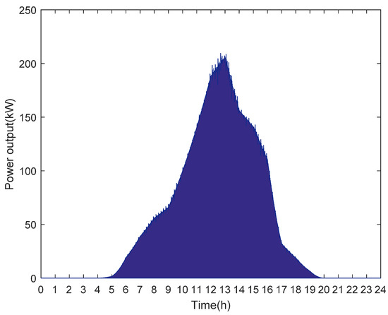 For photovoltaic power generation system, it is necessary to determine the input light and temperature. The output power of the photovoltaic power generation system can be obtained by inputting light and temperature into the photovoltaic array as shown in Figure 6. It can be seen from the figure that the output power of photovoltaic power generation system is concentrated in the day when there is light.