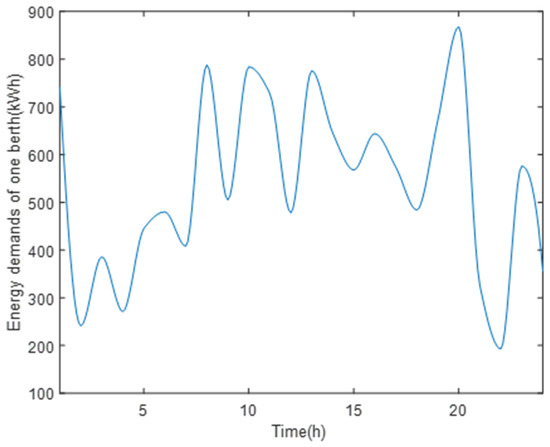 Since the ship load and the number of ships on the shore of the port change in real time within 24 h of a day, it is necessary to simulate the energy demand of the ship shore before the grid power distribution is carried out, and then the power supply cost can be calculated. In this study, the energy demand of ship shore power in a berth is simulated in the range of 100–1000 KWh, and the energy demand of ship shore power in a berth is shown in Figure 7.
