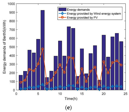 Set the simulation time to 24 h and 5 port berths. The cost of hybrid power supply system calculated by genetic algorithm is 41,963.84 yuan. The corresponding grid node parameters are shown in Table 4, and the energy and power distribution results of each berth are shown in Figure 8. The mixed energy power supply cost calculated by particle swarm optimization algorithm is also 41,963.84 yuan, and the corresponding grid node parameters are shown in Table 5. In order to prove that the power supply cost can be effectively controlled after the addition of hybrid energy power supply system, this paper calculates the power supply cost of traditional shore power. The power supply cost of traditional shore power is the generation cost of using grid power supply. The price of 24 h a day is shown in Table 3. After calculation, the cost of the traditional power supply system is 43,042.15 yuan, which shows that the hybrid energy system is more cost-saving than the traditional power supply system, and the results obtained by the two optimization algorithms are almost the same.