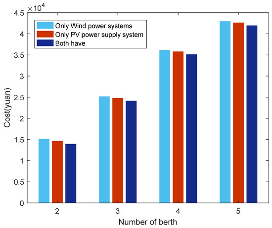 The above situation is the power distribution of the five berths. Table 6 shows the comparison of power supply costs between hybrid power supply system and traditional grid using different algorithms under different berth numbers. As can be seen from Table 6, the cost of the hybrid power supply system is always lower than that of the traditional power supply system, regardless of the number of berths.