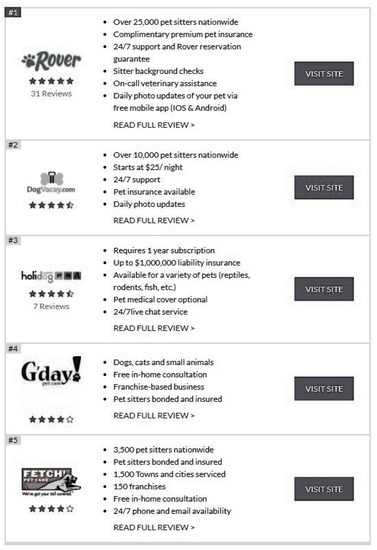 - Consumers Advocate “10 Best Pet Sitting of 2018”. 2022. Available online: https://www.consumersadvocate.org/pet-sitting/best-pet-sitting (accessed on 25 October 2022).