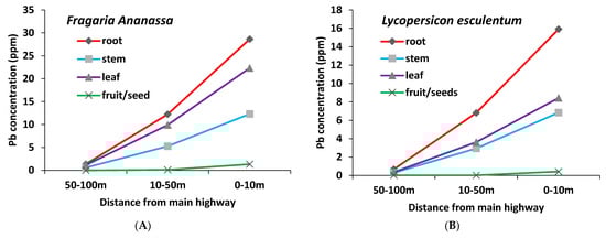 The concentration of Pb in various parts of the experimental plants (strawberry, tomato, wheat, tobacco, and sugarcane) is presented in Figure 2A–E. Pb uptake was higher in plants nearest to the main highway. Pb concentration was highest in strawberries compared to other studied plants. The higher Pb concentration in parts observed in order, i.e., roots > leaves > stem > fruits in strawberry, tomato, and tobacco. At the nearest to the road, the strawberry and tomato fruits, leaves of tobacco and stem from sugarcane showed the highest Pb concentrations, which were above the WHO permissible limits (i.e., 0.3 mg kg−1). Thus, our results depict that Pb concentration exceeded the threshold level [26] in various parts of the plants including edible fruit sections of strawberries and tomatoes. Khan et al. [55] found a higher concentration of Pb in leaves of certain crop plants such as cauliflower, spinach, tomatoes, and carrot that was above the permissible limit. These results support the findings that plants can accumulate high concentrations of lead in their tissues. Ahsan et al. [56] worked on some edible plants and observed that Pb and Cd contents were above the recommended thresholds in edible portions, while Arora et al. [57] had similar findings in edible portions of vegetables, which is of great concern because of potential health hazards to human beings. In tomato seedlings, Pb uptake, distribution, and accumulation were highest in the root, followed by the leaf, shoot, and fruits. The uptake of HM by crop plants depends upon the type of species as well as the physicochemical characteristics of the soils. Through different mechanisms, Pb accumulation in many plants exceeds a hundred times the maximum threshold levels according to WHO [26], thus posing a threat to public health.