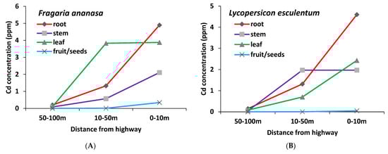 Cd concentrations in different parts of the five studied plants are shown in Figure 3A–E. The concentration of Cd in plants reduced with increasing distance from the road, i.e., 0–10 m > 10–50 m > 100 m. In strawberry plants, the concentration of Cd was highly significant. Like Pb, Cd concentration was highest in roots, followed by leaves in strawberries, tomato, and tobacco; however, in the case of wheat and sugarcane, it was higher in stems. Strawberry fruits and tobacco leaves have Cd concentrations above permissible levels [26]. The diminution in Cd concentrations with increasing distance from the road exhibited that emissions from automobiles contribute a substantial amount of metals in the roadside farmlands [58]. Ahsan et al. [56] observed Cd contents in edible parts of plants that were not according to the threshold limits of the WHO. Similarly, Liu et al. [59] reported higher concentrations of toxic HM in vegetables. Therefore, Cd build-up in edible portions of crops and vegetables is of increasing concern.