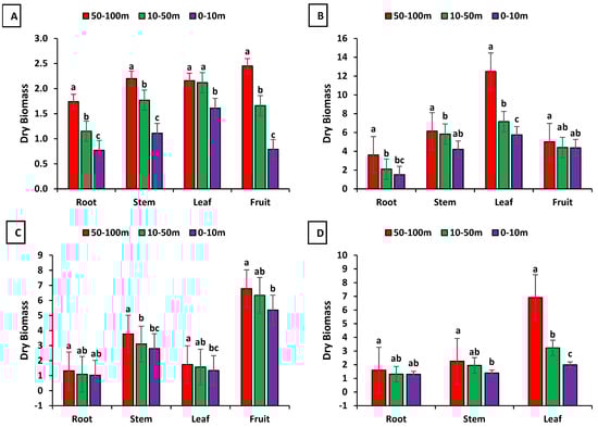 (A–E) Comparison of dry biomasses of selected plant species (A) = Strawberries, (B) = Tomatoes, (C) = Wheat, (D) = Tobacco, and (E) = Sugarcane at different distances from the road. The bars with different letters are significantly different from each other at α = 0.05.