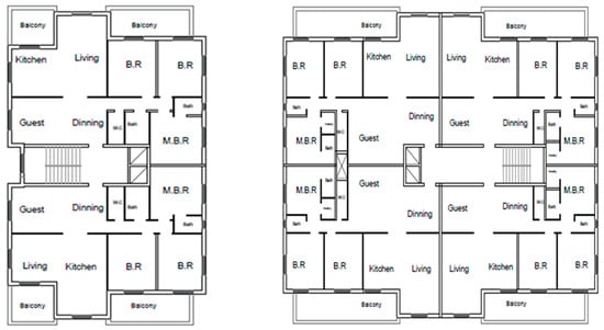 These most commonly used residential building types were selected to build the simulation model to compare the benefits of the implementation of different building energy codes [32]. Two apartment building types were selected for the simulation: buildings with two apartments per floor and four apartments per floor, as seen in Figure 2. The reason for choosing these two different types of apartment buildings was to take into account the exposure to the outside environment, with the first type having the highest exposure and the second the lowest exposure, for the most commonly used apartment building types in Palestine.