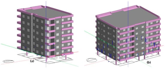 DesignBuilder modeling: (a) two-apartment building, (b) four-apartment building, the pink color represents the balconies and parapets, and grey color represent the external envelope.