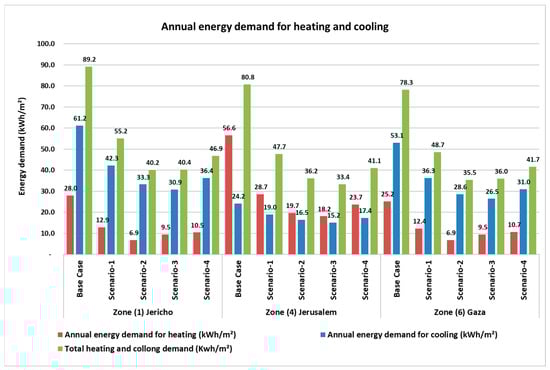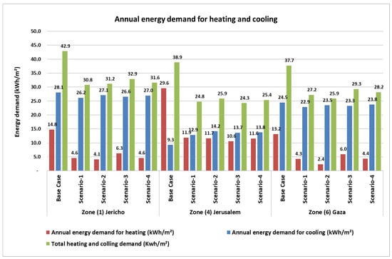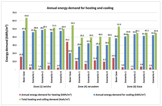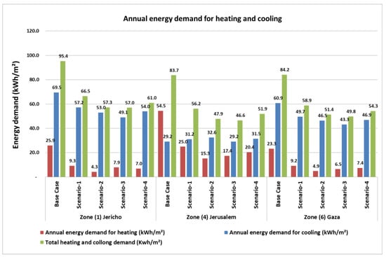 Scenario 4: Addition of thermal insulation to the base case according to the Jordanian building energy code and use of similar, new window U-values for the different climatic zones.