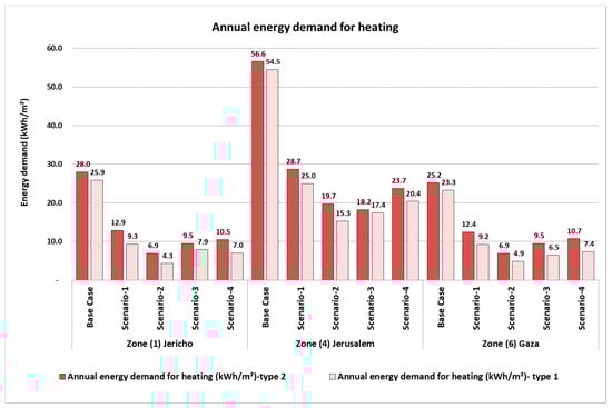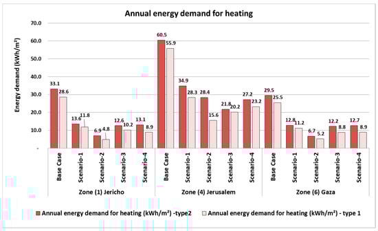 The different building types showed different reductions in energy demand when adding thermal insulation. Building type 1 (two apartments per floor) had the greatest reduction when scenario 2 (Palestinian green building guidelines) was applied and building type 2 (four apartments per floor area) had the greatest reduction when scenario 3 (ASHRAE standards) was applied.