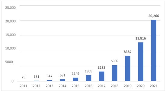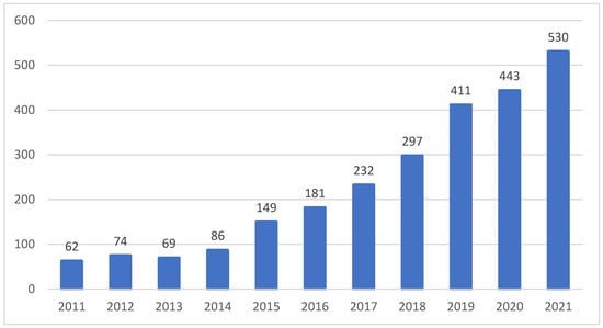 According to the Web of Science database, 2534 papers have been published on zero-waste management and sustainable consumption, only considering articles, reviews, letters, and notes. During the last decade, the growth of publications related to this area was exponential (Figure 1). In more detail, from 2011 to 2014, the number of published articles remained stable. However, since 2015, the increase has been drastic, standing out with greater emphasis during 2019–2021, with 54.61% of the total publications. This evolution demonstrates the significance of this topic in contemporary literature.