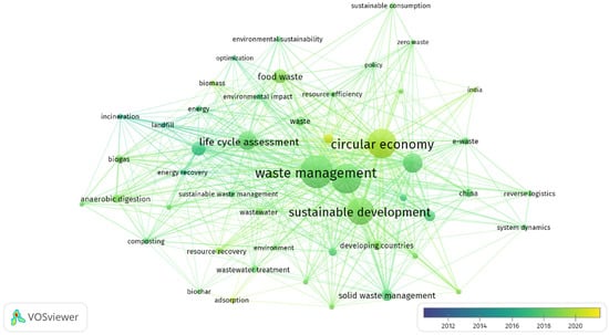 According to the VOSviewer (version 1.6.18, Centre for Science and Technology Studies, Leiden University, The Netherlands) findings, the three most relevant clusters are red, yellow, and blue (Figure 3). In the red cluster, the most used keywords are waste management, sustainability, and sustainable development, with 301, 261, and 255 occurrences, respectively. This group of articles is grouped by the direct relationship between waste management and sustainable development, in how changes in environmental behavior have modified the behavior of individuals when making decisions with a sustainable approach. In the case of the yellow cluster, the circular economy concept is the most influential, with 255 repetitions. This group focuses on articles highlighting the importance of a sustainable and friendly economy with society and the economy in how new environmental policies and strategies of society and institutions contribute to a more environmentally friendly world. Finally, the most relevant term in the blue cluster is life cycle assessment, with 130 occurrences. This group of articles focuses on the systematic analysis and evaluation of the cycle of life in the face of environmental impact, focusing specifically on the stages of waste disposal and environmental impact.