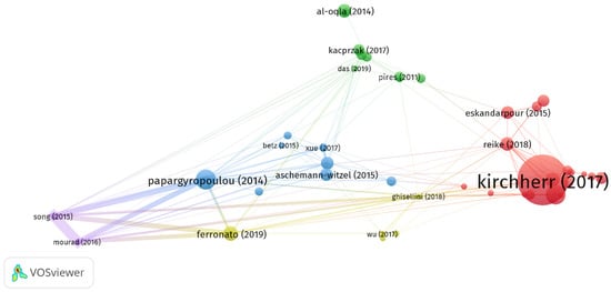 The bibliographic coupling method performs a second analysis of the most cited articles. For this analysis, documents with at least 150 citations have been considered in VOSviewer (version 1.6.18, Centre for Science and Technology Studies, Leiden University, The Netherlands). As a result, 50 papers have been classified and grouped into 5 clusters (Figure 5). In addition, these articles have been grouped concerning their content similarity in keywords, titles, and abstracts. The article by Kirchherr, Reike, and Hekkert is the first of the red cluster’s 19 publications [20]. The most significant piece in the green cluster, which consists of 9 papers, is Al-Oqla and Sapuan [102]. The most notable article of the eight investigations in the blue cluster was written by Papargyropoulou, Lozano, Steinberger, Wright, and Ujang [98]. In the instance of the yellow cluster, which consists of five articles, Ferronato and Torretta’s work is the most often mentioned [99]. Finally, the research by Mourad [122], which comprises just two publications, sits at the top of the purple cluster.