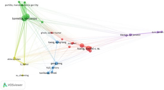 An additional method of analyzing the author is through bibliographic coupling. This analysis is helpful in structuring the research collaboration networks [124]. Figure 7 shows a scientific mapping by author bibliographic coupling. VOSviewer (version 1.6.18, Centre for Science and Technology Studies, Leiden University, The Netherlands) was used to produce a map that reveals the structure of the most influential authors. The results illustrate the number and relationships of references the analyzed articles have in common with authors who have participated in at least 6 publications and obtained at least 40 citations. As a result, 5 clusters of authors have been created (28 authors in total). According to the author’s analysis, the articles with the highest link strength were written by collaborative group leaders Vicenzo Torretta and Ferronato Navarro (Green cluster). In addition, the leaders of each cluster are Tsang (Red cluster), Ruben Aldaco and Jinhui Li (Yellow cluster), Ming-Lang Tseng (Blue cluster), and Neven Duic (Purple cluster).