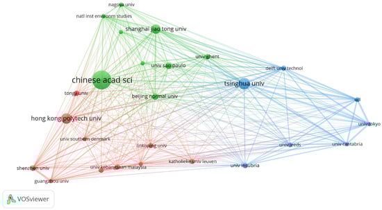 On the other hand, a relational analysis has been developed for those institutions with more than fourteen associated articles through the VOSviewer (version 1.6.18, Centre for Science and Technology Studies, Leiden University, The Netherlands) software [125]. As a result, the research institutions have been grouped into three clusters (Figure 8). This map helps us know which universities collaborate and create knowledge together. According to the results, the Chinese Academy of Sciences is the principal institution in the green cluster, which comprises nine institutes (China). Hong Kong Polytechnic University (China) leads the red cluster of ten institutions, and Tsinghua University oversees the blue cluster of seven institutions (China). Therefore, the results can affirm that Chinese institutions are at the forefront of the current research on zero-waste management and sustainable consumption.