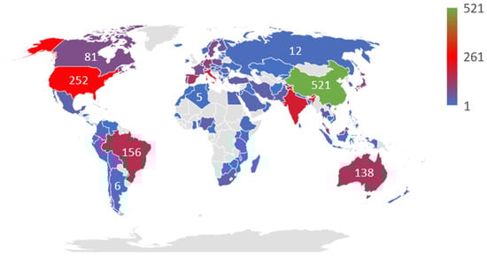 Table 8 is provided concerning geographical construction by country. The results indicated that only 20 of 115 countries (17.39%) had published 1 article, 39 countries had published between 2 and 10 articles, and 56 countries had written 11 articles (48.70%). There is a concentration of scientific publications in this research approach. For example, Table 8 shows that the top 10 countries have 1985 out of 2576 affiliations of articles published (77.05%). In more detail, the most productive nation is China, with 521 articles associated, followed by the United States (252 associations) and England (202 affiliations).