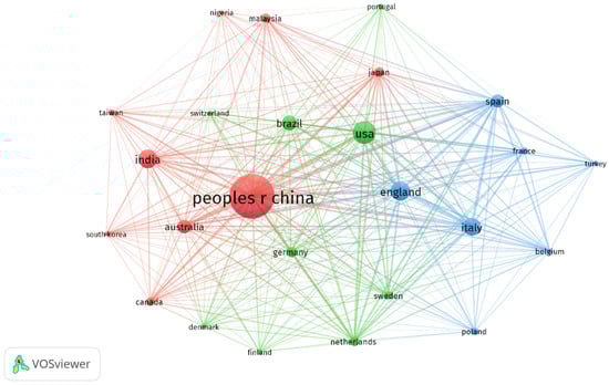 Now we will focus on the collaboration network of countries. Nations have analyzed at least 40 associated articles through a bibliographic coupling. The VOSviewer (version 1.6.18, Centre for Science and Technology Studies, Leiden University, The Netherlands) software shows the grouping of the 25 countries into 3 clusters (Figure 10). The top countries in the red cluster are China, the United States in the green cluster, and England in the blue cluster.