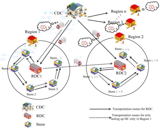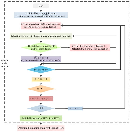 - A candidate solution is generated from the initial solution by reducing RDC. is selected randomly, and then the nearest is selected to deliver it, then its regional stores are distributed by .