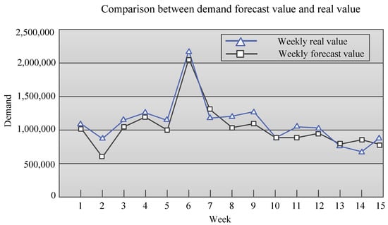 The logistics distribution times of garment chain retail enterprises are limited, the distribution volume of CDC and RDC is directly related to the order volume of each store, and the output of the production plant group comes from demand forecasting. As a result, the research on the sustainable combined location-inventory-routing problem based on the demand forecast will provide decision support and practical guidance for the logistics network planning of such enterprises. Therefore, the paper uses the garment chain retail enterprises as an example to illustrate the demand forecasting process. The weekly sales data of summer clothes of an enterprise in 15 weeks were collected. The complexity of the clothing sales process mainly lies in the listing and withdrawal of clothing in batches. For example, in the marketing plan for a men’s t-shirt, the sales season is generally 15 weeks. During the sales season, the products are listed in four batches: the time interval between the first batch and the second batch is two weeks, the time interval between the second batch and the third batch is two weeks, and the time interval between the third batch and the fourth batch is three weeks. Different batches of garment products have different marketing themes and sales deadlines. The sales time of the first, second, third, and fourth batches is seven, five, six, and eight weeks respectively.