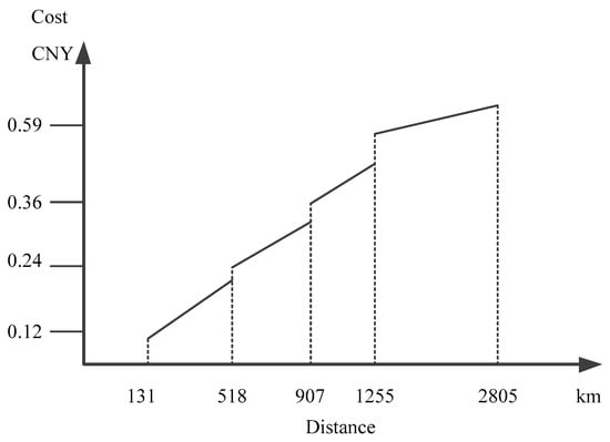 The different transportation distances and routes cause differences in the unit transportation cost. Through unifying the actual data, the piecewise function of the unit transport costs is shown in Figure 6.