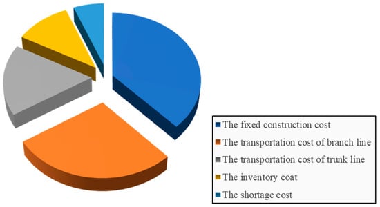 It can be concluded correspondingly that the proportion of various costs in the total cost is: the total cost of fixed construction is 38%, the transportation cost of trunk line is 17%, the transportation cost of branch line is 28%, the inventory cost is 11%, and shortage cost is 6%. It can be seen that fixed construction and transportation costs account for most of the total logistics costs. The proportion of inventory and shortage cost is not very high, but it should also be considered.