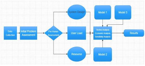 A methodology was created and used throughout the research to ensure practical work was accomplished. Figure 1 shows the plan of the methodology used. The methodology focused research on the importance of resolving the electricity shortfall issue of Gwadar, using renewable energy sources. The following steps involved collecting data on solar and wind energy to identify how much power could be generated. This was then used to produce the demand profile that could be used in the HOMER model (Hybrid Optimization Model for Multiple Energy Resources). This study used the following analytical framework [41] (Figure 1 shows methodology flow charts).