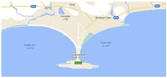 Pakistan is a developing country that is struggling to accelerate its economic growth and keep pace with the region’s fast-expanding economies. Energy, economic, and industrial crises are major concerns in Pakistan. To overcome these issues, Pakistan must engage in various projects. One such initiative, the China-Pakistan Economic Corridor (CPEC), has already begun. According to the author of [42], the CPEC investment is USD 46 billion, with the main goal of connecting China and Pakistan to the Middle East and conducting trade. All trade will be conducted from Gwadar, Pakistan, because it is positioned on an international trade route, which is why Gwadar is significant. The biggest concern in Gwadar is a lack of energy: there is no national grid and electricity is imported from Iran [43]. Optimizing a system to overcome this challenge was chosen for this paper’s research, and a model was created for Gwadar. It has several renewable energy resources that can meet the city’s power needs. The Gwadar map is presented in Figure 2.