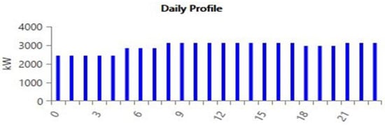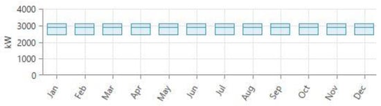 At present, 70 MW/day of electricity is imported from Iran to fulfill the demands of Gwadar. However, due to Iran’s own electricity demands, it does not supply the complete 70 MW, and consequently there is load shedding of 12–16 h per day. People use generators to fulfill the demand for electricity. The price of electricity imported from Iran varies due to oil prices and Pakistan buys it in US dollars, for prices ranging from 8 cents/kWh to 11 cents/kWh [45]. Gwadar’s load is based on a power market survey conducted by NTDC (National Transmission and Dispatch Company) and QESCO (Quetta Electricity Supply Company) [46]. The daily and seasonal load profile is shown in Figure 3 and Figure 4. Load variation can be due to many reasons, including economic factors, customer behavior, and weather conditions. This means there are uncertainties regarding load. The results of [47] show that weather has a correlation with load. The components of weather are temperature, humidity, and wind speed. They influence load variance owing to the use of heating or cooling units. In Figure 4, the box plot of load variation shows that there is no outlier, which means that the estimated load is realistic. The box plot shows that the maximum load is 3123 kW and the minimum load is 2423 kW. The box plot of solar daily radiation and monthly average wind speed shows that there is a variation in energy sources due to weather, which has an impact on load variation. In Figure 5b, it can be seen that 3.59 kW/m2/day is minimum daily radiation, 5.29 kW/m2/day is median of daily radiation and 6.46 kW/m2/day is maximum daily radiation. In Figure 6b it can be seen that 4.24 m/s is the minimum wind speed, 4.7 m/s is median of wind speed and 5.28 m/s is maximum wind speed. That is why load variation can be visible in the load profile when the load is less in some hours and increased in others. For example, during peak hours, the load is higher, whereas during non-peak hours, the demand is lower.