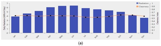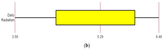 (a) Annual daily radiation and clarity index [48]. (b) Box plot of annual daily radiation [48].