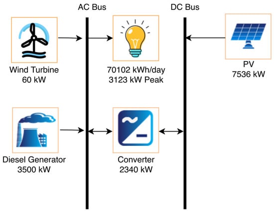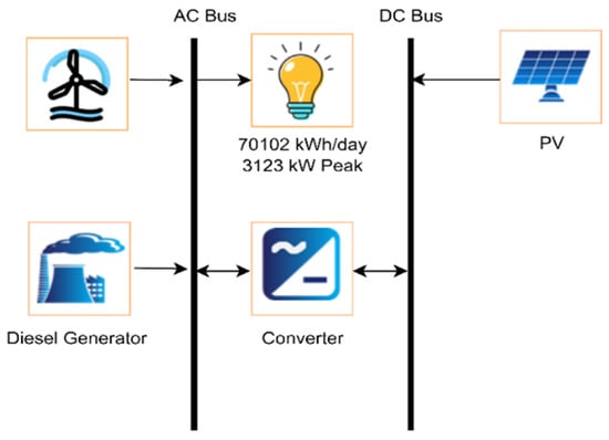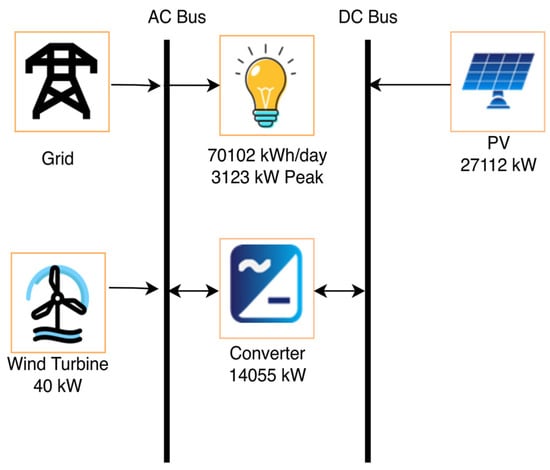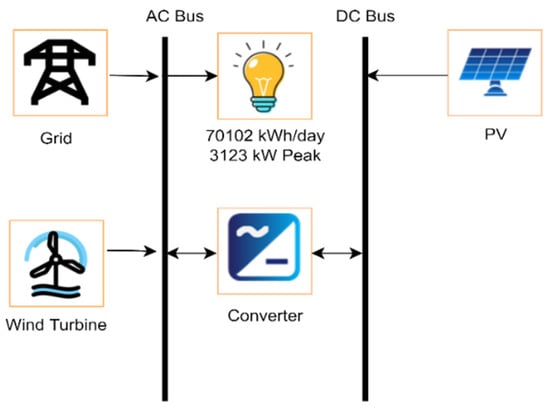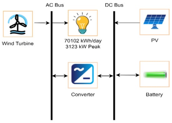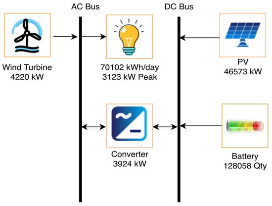 It was necessary to initially build the system architecture to mimic the renewable energy system. There were two models in this instance, each of which included the photovoltaics, wind turbines, batteries, grid connections, and capacity that was previously mentioned. Figure 7, Figure 8 and Figure 9 exhibit the schematic representations of the three distinct model designs, respectively. Table 1 lists all of the specific details of the proposed systems. The proposed systems’ location is 4867+5Q Gwadar, Pakistan (25′6.6″ N, 62′18.9″ E). Solar panels, wind turbines, battery banks, and grid connectivity make up the scenario of the recommended renewable energy system.