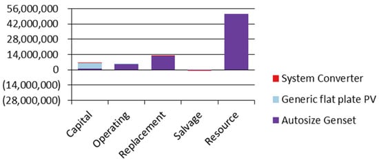 The normal price per kWh of usable power the system produces as electrical energy is what HOMER refers to as the levelized cost of energy (COE). The total annualized cost less the cost of feeding the load is the cost of producing power annually, which is then divided by HOMER’s total output of usable electricity. The following equation was used to determine COE [48]: