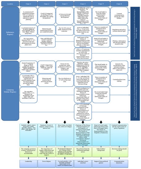 Fifth: Factor of Supporting Party Politics. One of determining factors in planning and policy making is the political factor [60]. The power, control, and relations of individual actors in South Lampung made this regency area have more benefits than Indramayu. The fact that no such political actors operate in Indramayu reflects the imbalances in the implementation of the policies found there caused by their absence. On the other hand, the role of the legislative members in the central government representing the region of Indramayu have not been as evident as the roles played by those representing South Lampung Regency, one of which happened to serve as the chairman of the Commission IV of the National Legislative Body—HRRI. Thus, this individual has a lot to do with the consistency and integration between programs that are planned in the central government (MoA) and those that are planned in the regional government (Indramayu Regency), as the Commission IV HRRI partners directly with the Ministry of Agriculture. So, the existence of the power of individual actors, as mentioned before, gives South Lampung a particular privilege in ensuring consistency in the planning process and implementation between the national and in the regional contexts.