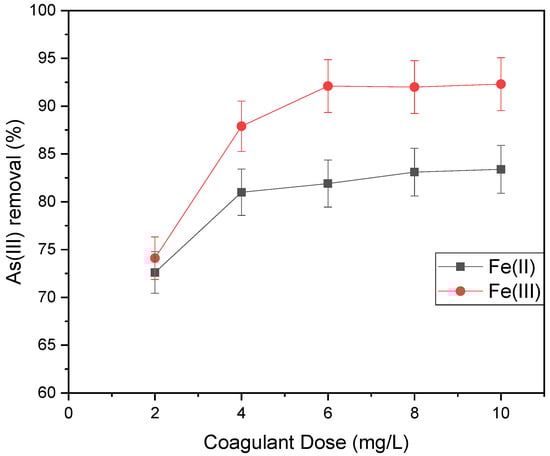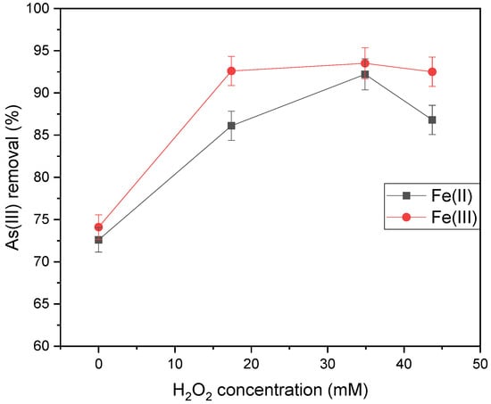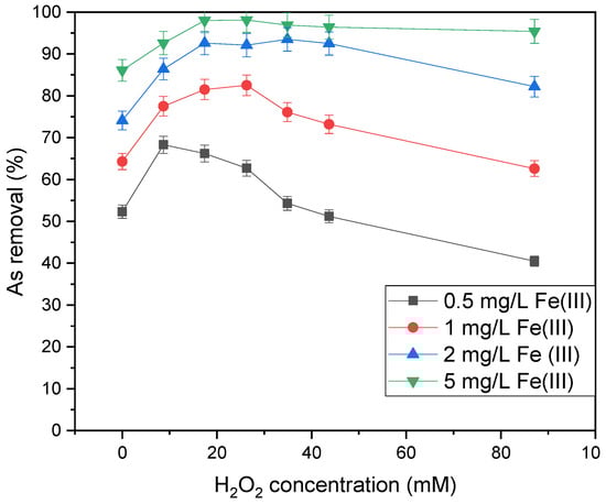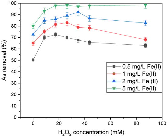 The conventional Fenton process is a wildly used method for removing arsenic from water [,]. Therefore it was important to compare the Fe(III)/H2O2 coagulation process with the Fenton process to check if it is a viable alternative for As removal. The effect of initial Fe(II) dose is shown in Figure 4. As expected, the initial dose is very important, and its increase improves linearly arsenic removal. Increase of coagulant dose from 0.5 mg/L to 1 mg/L had a positive effect with rise in As(III) sequestration. Further increase of the coagulant dose from 1 to 2 mg/L had similar effect and the removal effectiveness rose by 4.5 to 14.6%. The effect of H2O2 is clear and the As(III) sequestration was enhanced significantly by 18–22% depending on the concentration used. We also observed that maximum removal efficiency occurred at different H2O2 concentrations. Moreover, as the coagulant dose increases the necessary H2O2 concentration to achieve the maximum As(III) sequestration. When 2 mg/L were used, 34.9 mM of H2O2 were added to maximize the efficiency. As the initial dose decreased to 1 mg/L the most efficient removal was observed at 26.3 mM H2O2. Further decrease of initial dose to 0.5 mg/L decrease the required H2O2 concentration to achieve better As(III) removal to 17.4 mM. This did not apply in the experiments with coagulant dose of 5 mg/L, where the use of 26.3 mM achieved the best result. However, in further experiments the coagulant dose of 5 mg/L was not used despite achieving the best result. This was chosen because in the Fe(III) coagulation, it was stated that the difference in the As removal between 2 and 5 mg/L did not justify the use of more than double the coagulant dose. Since we use 2 mg/L in the Fe(III) coagulation system it was decided that for comparison reasons, the Fe(II) dose would be also 2 mg/L. Decline of As(III) removal is much smaller when Fe(II) was used. The reduction of removal effectiveness was similar for Fe(II) doses of 0.5–2 mg/L around 10–15% which was smaller than the decline observed in the Fe(III)/H2O2 coagulation system. The mitigation of the decline by increased dose was apparent when 5 mg/L of Fe(II) were applied in the system where no decline was observed. The smaller decline at 0.5–2 mg/L takes place because hydrogen peroxide reacts with Fe(II) and decomposes rapidly. Theoretically, 1 mol of Fe(II) can catalyze the decomposition of up to 50 mol of hydrogen peroxide []. It was suggested that Fe(II) ions are involved in a cyclic process, perhaps oscillating between the Fe(II), Fe(IV), and Fe(III) oxidation states a number of cycles before final oxidation and precipitation of Fe(III) occurs. Additionally, 2 mol of hydrogen peroxide are destroyed in one cycle of oxidation of Fe(II) to Fe(III) []. Therefore, most of H2O2 has reacted with Fe(II) to oxidize it and less H2O2 is capable to compete with As(III) for the surface-bound OH• radicals on the surface of created Fe(III) assuming a part of the reaction takes place in the Fe(III) surface and/or Fe(IV) and with dissolved oxygen for the intermediate As(IV).