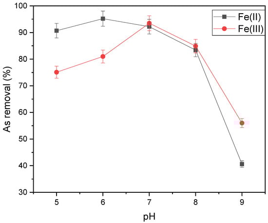 After examining the effect of initial dose of iron and its implications in correlation with the concentration of hydrogen peroxide it is of critical importance to investigate the effect of pH on the As(III) removal. Typical pH values encountered in ground waters are in the range of 6–8 []. We decided to examine the effect of pH in a slightly bigger range of 5–9 to test if the method is capable of removing As(III) efficiently in a broader range of pH. We examined the effect of pH for both Fe(II) and Fe(III) treatment systems. The experiments were performed with the same initial concentration of As(III) at 100 μg/L as all the previous experiments. From previous results, treatment of water with 2 mg/L and 43.7 mM H2O2 gave the best results for the Fe(II) process and these conditions were chosen to perform the experiments examining the effect of pH. The results shown in Figure 5 indicated an excellent As(III) removal with Fe(II) application for pH values between 5–7. Under these conditions As(III) removal of above 90 percent was obtained, and the treated water had arsenic residual concentration below the regulation limit of 10 μg/L. Increasing the pH to values above 8, we observed a great decline in the As(III) sequestration. At pH 9 only 40% of As(III) was removed in the Fe(II) system. The same effect was observed when Fe(III) was the coagulant with slightly more efficient removal especially at pH 9. This can be attributed to the fact that the solid iron surfaces that are formed have a negative overall surface charge at high pH values with the form of FeOH4− [,]. Its negative charge repulses the formed As(V) (HAsO42−), therefore, the adsorption of As(V) onto surface of ferric iron is diminished and as a result the removal of arsenic is also significantly lowered.