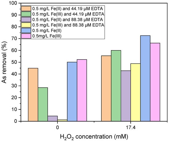 Enhancement of the coagulation process with hydrogen peroxide increased the As(III) sequestration in EDTA containing water as shown in Figure 6. However, the EDTA still had an inhibiting effect, which increased when the EDTA concentration was doubled. This is expected for two reasons. Firstly, EDTA is known to be oxidized by oxygen and to have affinity for OH• radicals []. Secondly, the kinetics of hydrogen peroxide decomposition by chelated Fe(II) and Fe(III) with EDTA are 3 orders of magnitude greater than non-chelated Fe(II) at pH 7 which creates reactive oxygen species and mostly OH• radicals for which EDTA has great affinity []. Also, Fe(II)-EDTA reacts with molecular oxygen and in the process of oxidation to Fe(III)-EDTA it creates H2O2 [,] which we believe it can induce decomposition of EDTA and oxidation of As(III) by OH• radicals. Therefore, reactive oxygen species are formed which react with EDTA and decompose it. This means that the iron is released and then can precipitate and subsequently remove arsenite. The release of OH• radicals during EDTA decomposition by dissolved oxygen can explain the fact that a small part of As(III) can be oxidized even when H2O2 was not used (Figure 7).
