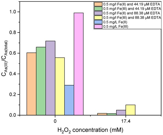 The effect of EDTA on residual As speciation and comparison with experiments without EDTA. Initial concentration of Fe(II) and Fe(III) was 0.5 mg/L, pH = 7.