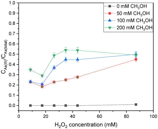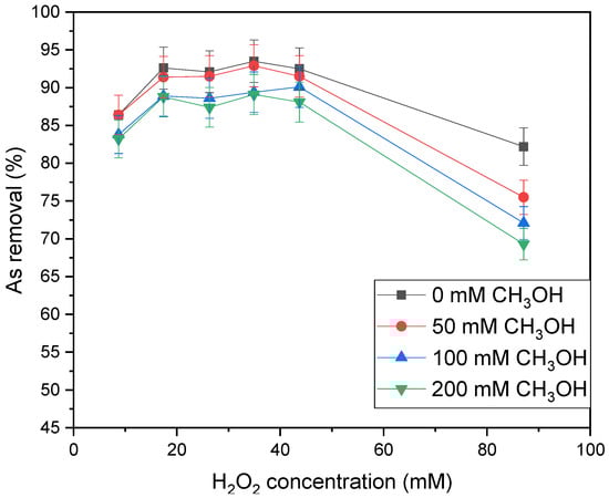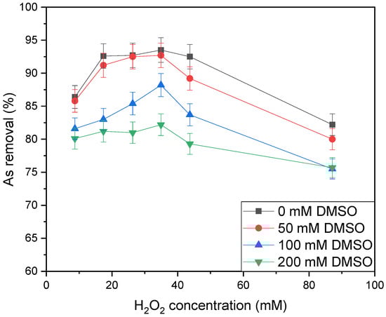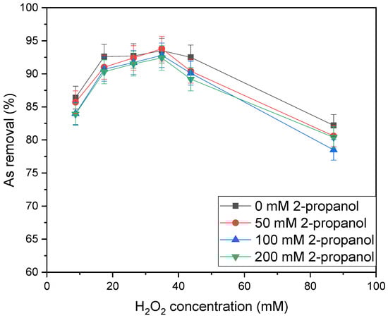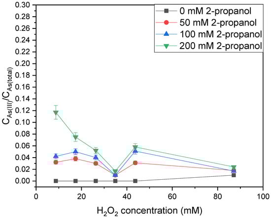 Three radical scavengers were applied to identify the reactive oxygen species which promote the As(III) oxidation and subsequently the removal of arsenic as As(V) during the enhanced coagulation process. As radical scavengers, 2-propanol, methanol and DMSO were applied. 2-propanol is capable to scavenge OH• radicals while DMSO and methanol are able to scavenge both OH• radicals and Fe(IV) species. The latter two scavengers have different affinity towards Fe(IV) with kinetics for the reaction of Fe(IV) (Fe=O2+) with methanol and DMSO are 5.72 × 102 and 1.26 × 105 M−1 s−1 respectively [,,]. 50, 100 and 200 mM of scavengers were applied and their effect on the arsenic removal and on the As(III) oxidation was investigated. Fenton reaction is a well-known reaction with an established mechanism [], therefore, we investigated the nature of the reactive oxygen species (ROS) only in the Fe(III)/H2O2 system since it is not as well studied as the Fenton reaction. Initial dose of the coagulant was at all cases 2 mg/L. 2-propanol had a negligible effect on both the As removal (Figure 8, Figure 9 and Figure 10) and the As(III) oxidation (Figure 11, Figure 12 and Figure 13) even when 200 mM were added which is a very high concentration relative to the coagulant dose used. This shows that most likely, hydroxyl radicals were not involved in arsenic uptake during coagulation with H2O2-Fe(III). Since 2-propanol proved that hydroxyl radicals did not oxidize As(III), methanol and DMSO could be considered as Fe(IV) scavengers. Methanol had a slightly negative effect on the As removal which can be attributed to the small affinity for Fe(IV) even at 200 mM (Figure 8, Figure 9 and Figure 10). However, its effect increased slightly at very high H2O2 concentration (87.1 mM). This was observed at all concentrations used. Methanol inhibited the As(III) oxidation since half of the residual arsenic remaining was As(III) (Figure 11, Figure 12 and Figure 13). It is reported that at neutral pH in a Fe(II)/H2O2 system Ferryl species is created as an oxidant that is highly selective towards As(III) []. This is in agreement with our findings because high concentrations of methanol relative to initial arsenic concentration were required to induce inhibition of oxidation.