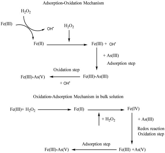 Oxidants that are mostly used are ozone (O3), chlorine, [] sodium permanganate (NaMnO4) [], persulfate (PS), peroxymonosulfate [], calcium peroxide (CP), sodium percarbonate (SPC) [] and H2O2 []. As(III) removal by biological oxidation and adsorption has also been studied and is a widely applied technology worldwide [,]. Fenton process is also able to oxidize As(III) to As(V) because of formation of hydroxyl radicals, and then the produced As(V) can be removed by adsorption of the formed iron oxides []. In a similar manner, use of ZVI (Zerovalent Iron) can also oxidize As(III) and cause the removal of As(V) []. The use of hydrogen peroxide simultaneously with Fe(III) has not been extensively investigated up to now [,].