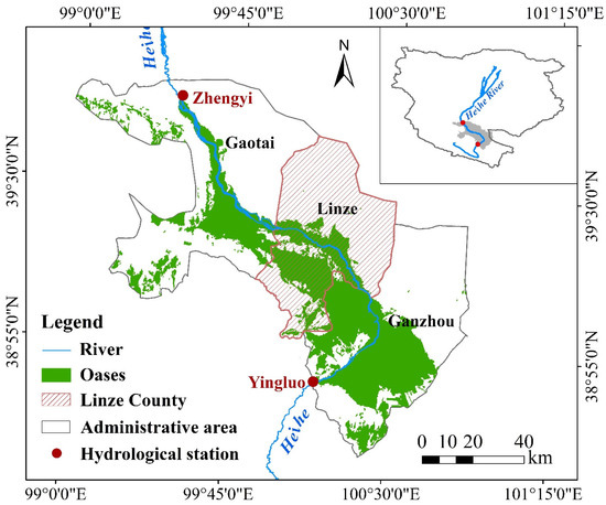 Accordingly, we selected the Linze Oasis, a typical middle reaches Oases in the Heihe River basin, as the research area in this study. We investigated the quantitative relationship between the ecosystem and society from a sociohydrological perspective [33], as well as the impact of water resource utilization on agricultural development. Furthermore, we conducted these investigations in terms of scale and structure for the years 1990 to 2020 (i.e., before and after the implementation of water distribution policies in the Heihe River basin) to reveal the regime shifts and cascading effects in the oases associated with policy, economic, and other factors. This study aimed to provide a scientific basis for decision making regarding the sustainable development of oases in arid regions, as well as to enhance our ability to address climate change and other systematic risks.