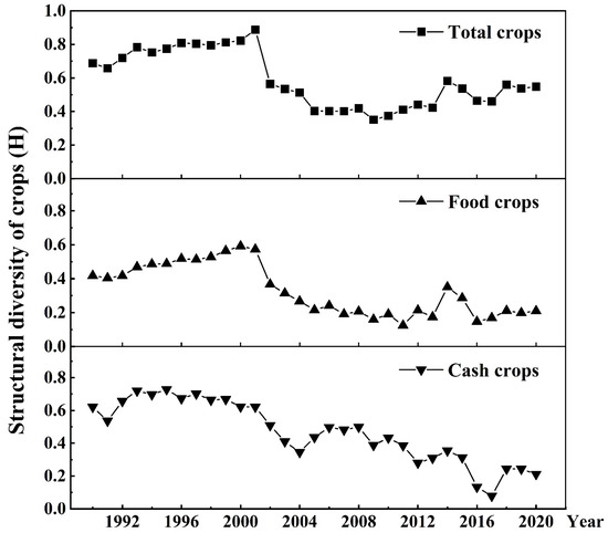 The crop structures between 1990 and 2020 are characterized as shown in Figure 3. Before the implementation of the water distribution policy in 2000, the overall structural diversity of crops increased from 0.69 in 1990 to 0.89 in 2001, where the food crops showed a slight increase from 0.42 to 0.57. After that, the area of crops rapidly increased from 0.34 × 104 hm2 in 2001 to 1.46 × 104 hm2 in 2009. Meanwhile, the overall H significantly decreased from 0.89 to 0.35; in particular, that of the food crops decreased from 0.37 to 0.16. Furthermore, the overall structural diversity rose to 0.55 in 2020 with the structural optimization of the crop, to a certain extent. The cash crops have shifted from being diversified, with the H decreasing from 0.73 to 0.21 in 2020, in which vegetables and chrysanthemum crops accounted for 80% and 15% of the total in 2015, respectively.