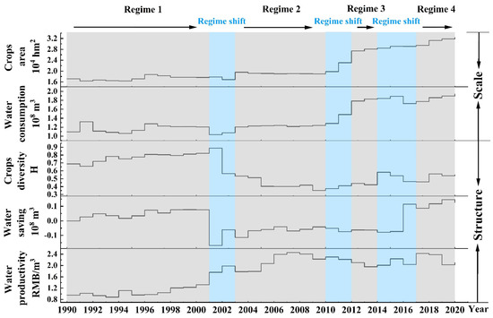 An interpretive framework based on the interaction between social and ecological elements is a specific evaluation system for the research on regime shifts [1,38]. There are two aspects within this that determine whether or not a regime shift has taken place: one is the relationship between the social and ecological systems, and the other is the degree of influence of each component of society and ecology [7]. The identification of the transitions depend on the statistical analysis of long-term sequences [39]. In this study, the mentioned framework was established for the scale (crop area and water consumption) and the structure (crop structural diversity, water savings, and productivity) to identify the regime shifts in oases, as well as the intervals between the shifts with different dominant drivers in accordance with the changes in the interaction between these social and ecological elements.