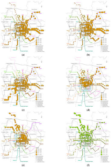 (1) Office facilities, catering facilities, FAR, the number of parking lots and whether it is a transfer station have a positive impact on the morning peak outbound ridership. Office facilities (Figure 4a) and FAR (Figure 4b) have significant impacts on outbound ridership of all subway stations. Under the similar spatial distribution characteristics of the impact coefficient, the closer to the eastern region of Beijing, the greater the impact of office facility density and FAR on the morning peak outbound ridership of subway stations; catering facilities (Figure 4c), the number of parking lots (Figure 4d) and whether they are transfer stations (Figure 4e) have a significant impact on the morning peak outbound ridership of most subway stations. Catering facilities have a greater impact on the southwest and eastern region of Beijing. The number of parking lots has a greater impact on the central district of Beijing’s urban area, mainly within the Third Ring Road, and it also has a greater impact on the morning peak outbound ridership of subway stations located in the east and northeast. Whether the station is a transfer station has a greater impact on the ridership of subway stations located between the East Second Ring Road and the East Third Ring Road, and it also has a greater impact on the ridership of subway stations that are located on the northwest subway lines;