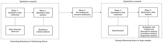 This study used an exploratory sequential mixed research method, in which we first explored influencing factors using qualitative data and analysis, then developed a questionnaire based on the influencing factors, and finally evaluated influencing factors in a large sample (Figure 1). Phase one’s goal was to address the research issue by defining the influencing factors with STGS. Phase two concerned developing a measurement instrument based on the survey data collected in phase one. The third phase involved conducting a massive survey and validating the questionnaire. We used the method of linear regression analysis to test these six influencing factors on tourists’ experiences with STGS in this phase.