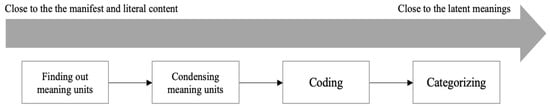 After collecting the data, we used qualitative content analysis method to analyze the data (Figure 3). The qualitative content analysis method aims to systematically transform a large amount of text into a highly organized and condensed summary of key findings, as well as analysis of raw data from verbatim transcribed interviews to form abstract categories or themes, with the goal of exploring the latent meanings from the manifest and literal content [42,43,44].