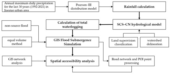 The methodology of this study is divided into the following four parts: (1) Calculating rainfall for different return periods used by the Pearson-Type III distribution model. (2) The SCS-CN hydrological model was used to calculate the total runoff for different return periods with the help of Excel 2021 software. (3) The inundation extent and inundation depth of the Jiaozuo urban area were simulated based on a passive inundation algorithm with the aid of ArcMap 10.2 and MATLAB R2021b. (4) Using GIS network analysis to measure the spatial accessibility of public services for medical and fire protection in Jiaozuo city. The technical route and specific research methods are shown in Figure 1. Relevant data in the flood simulation process are shown in Table 1.