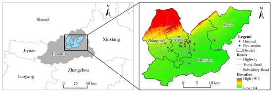 The frequency of extreme weather in response to global warming has major socio-economic impacts [11,12]. Jiaozuo, a medium-sized city in central China, has frequently experienced extreme weather events in recent years, which have caused serious losses. For example, during a major rainstorm weather process in Jiaozuo from 18 July to 23 July in 2021 the precipitation in the Jiaozuo urban area was 574.9 mm, accounting for 102.6% of the multi-year annual average precipitation (560 mm) in the Jiaozuo urban area. This extreme precipitation affected 147,000 people, and 46,000 people were relocated urgently. A total of 1018 houses collapsed, and 1393 houses were severely damaged. A total of 205.38 km of roads were damaged, and 50.26 km was blocked. The direct economic losses were about 3.34 billion yuan. Emergency response to urban pluvial flooding, especially in sudden-onset pluvial flooding scenarios, is the most direct and effective measure to reduce casualties. It can be observed that urban flooding not only causes great damage to urban transportation infrastructure, but also causes some roads with deep water, which impacts the accessibility of roads [13], causing major difficulties for emergency evacuation and the rescue of affected people [4,14,15]. Therefore, it is necessary to simulate flooding and study the accessibility of public emergency services in the Jiaozuo urban area.
