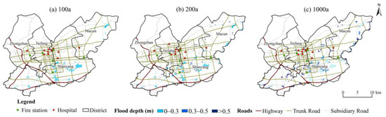 Under the urban pluvial flooding disaster scenario, it is possible to submerge the exhaust pipe when the road water reaches 30 cm (the general vehicle exhaust port height from the ground is about 25~35 cm, which is also the standard for some cities of closing the road), and vehicles cannot pass safely or are prohibited from passing, leading to the emergency response service not being able to reach the road or delaying reaching the road. Consequently, the spatial accessibility and service scope of road network becomes the most significant influencing factor of the emergency response capability of urban public service agencies [22]. The fastest route calculation based on GIS network analysis is adopted in this study without considering the constraints of urban traffic rules, and the road water depth of 30 cm (medical) and 50 cm (fire) are taken as the upper limit of vehicle traffic. Referring to the ‘Code for transport planning on urban road (GB50220-95)’ and the impact of flooding disasters on the speed of vehicles. It is assumed that the speed of vehicles is consistent at different time periods, and the driving speed limit is set according to the road grade: 60 km/h for highways, 45 km/h for trunk roads, and 30 km/h for subsidiary roads. The spatial coverage of 5 min, 10 min, 15 min and inaccessibility to medical emergencies and fire rescue under 100-year, 200-year, and1000-year three kinds of pluvial flooding return periods are calculated, respectively.