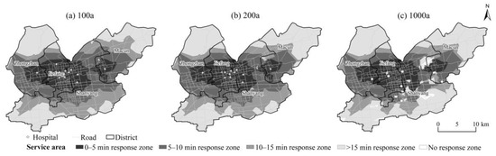 The hospitals with emergency response capability in the Jiaozuo urban area are concentrated in Jiefang District and the northern part of Shanyang District, and there are no hospitals in the inundation zone under three kinds of pluvial flooding scenarios. In general, the accessibility of medical emergency response showed a decreasing trend from the center to the periphery (Figure 4). Under the once-in-100a pluvial flooding scenario, medical rescue vehicles can reach 19.88% of the urban area in 5 min, 48.2% of the area in 10 min, and 70.69% of the area in 15 min. A total of 29.28% of the area cannot receive medical emergency services in 15 min, and the unreachable site is only 0.03%, which has a negligible impact on the reachability of the medical emergency response.