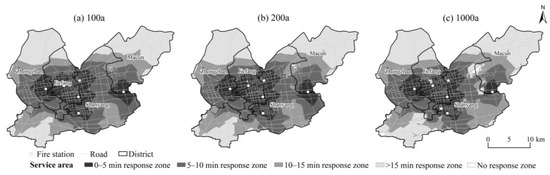 Under the once-in-100a pluvial flooding scenario, 5 min of fire rescue emergency response covers 19.65% of the Jiaozuo urban area. The 10 min and 15 min fire rescue emergency responses cover 49.73% and 70.06% of the region, respectively, and 29.39% of the districts received fire rescue services for more than 15 min.