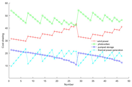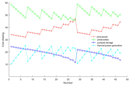 When the four energy sources are combined with various scales, they are calculated by Formula (6) to Formula (12), and the cost allocation is shown in Figure 2.