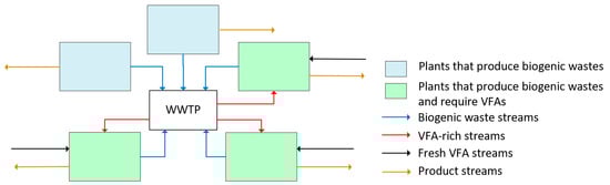 Additionally, as the biogenic waste sources are process- and location-specific, several factors such as the waste sources’ availability, sourcing distances and demand should be taken into consideration []. This is agreed with by Adams [], where a more sophisticated technology is required as a result of the wide versatility of waste sources in the BWB process. The technology should also be technically and economically feasible in addressing the aforementioned issues. During the implementation and development of the BWB EIP, efficient planning and evaluation of the participating plants, characteristics of the biogenic wastes, interception data of the WWTP interceptors, etc., are required. This is to ensure the effective valorisation of biogenic wastes to fulfil the demand of the VFA feedstock required by each participating plant.