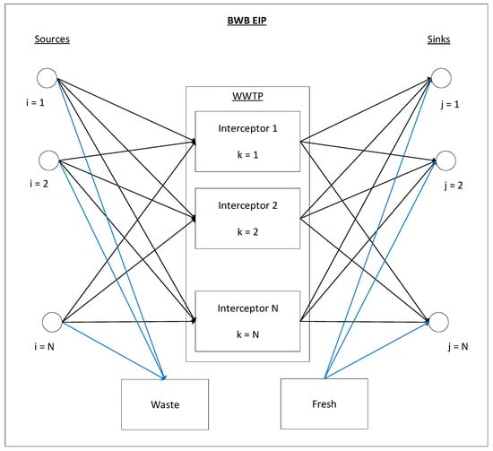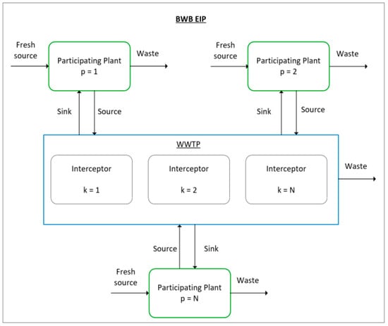 The indirect process integration within the BWB EIP through a WWTP which acts as a central utility hub is represented in Figure 2. The design of the BWB EIP is intended to treat various waste sources from a set of processes of the participating plants. The following method used in constructing the design of the BWB EIP is based on the methodology suggested by Lovelady and El-Halwagi []. The processes are referred to as PROCESSES = {p|p = 1, 2, …, NProcess}. For each process, a set of effluent wastewater streams from the participating plants is known as the sources: SOURCES = {i|i = 1, 2, …, Nsources,p}. Additionally, a set of process sinks is referred to as SINKS = {j|j = 1, 2, …, Nsinks,p} where a certain flowrate is required by each sink for the production processes.